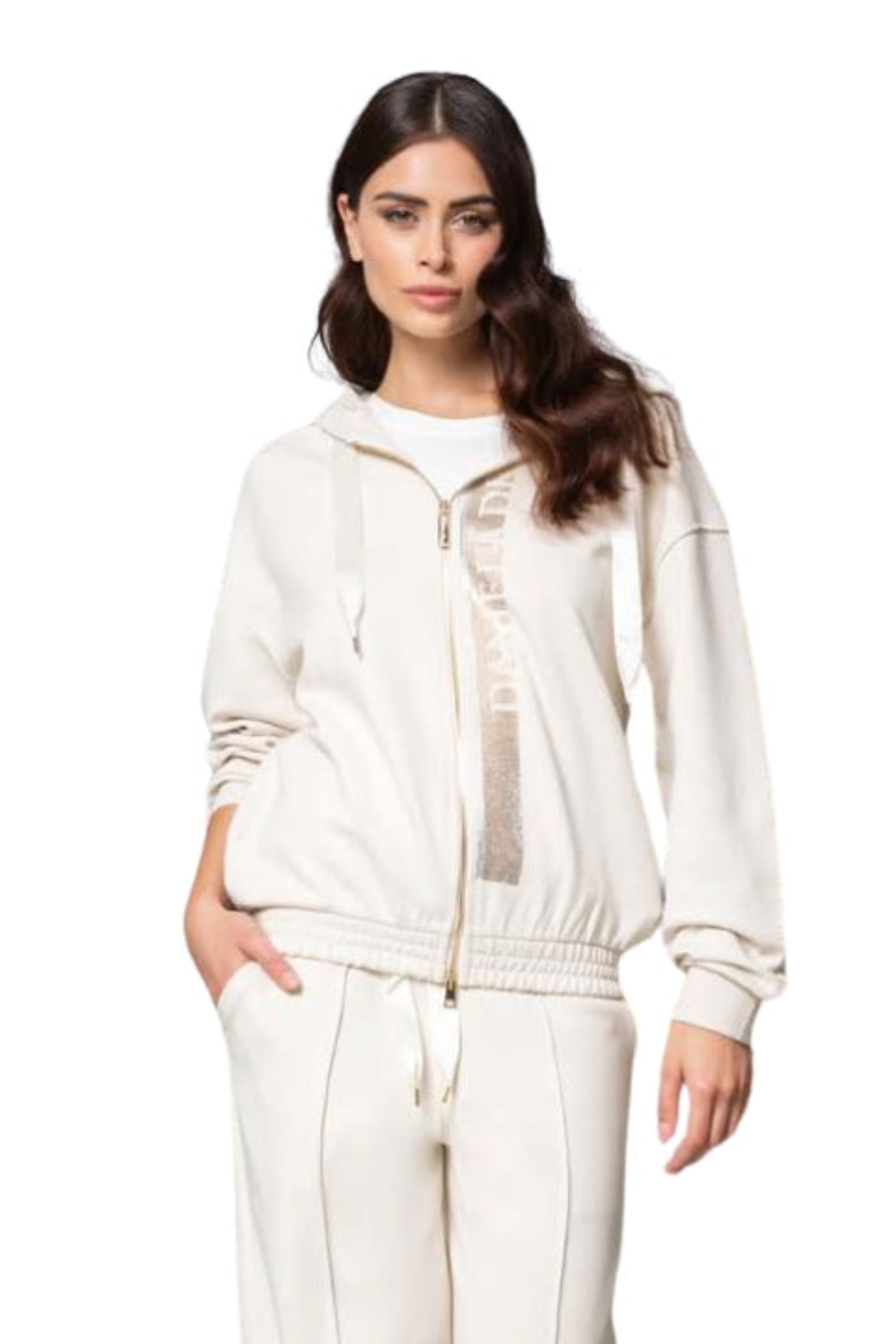 Casaca de buzo, cotton elastano, con capucha abierta, y estampado de swaroskys completo en el logo, cierre grande con hebilla dorada.