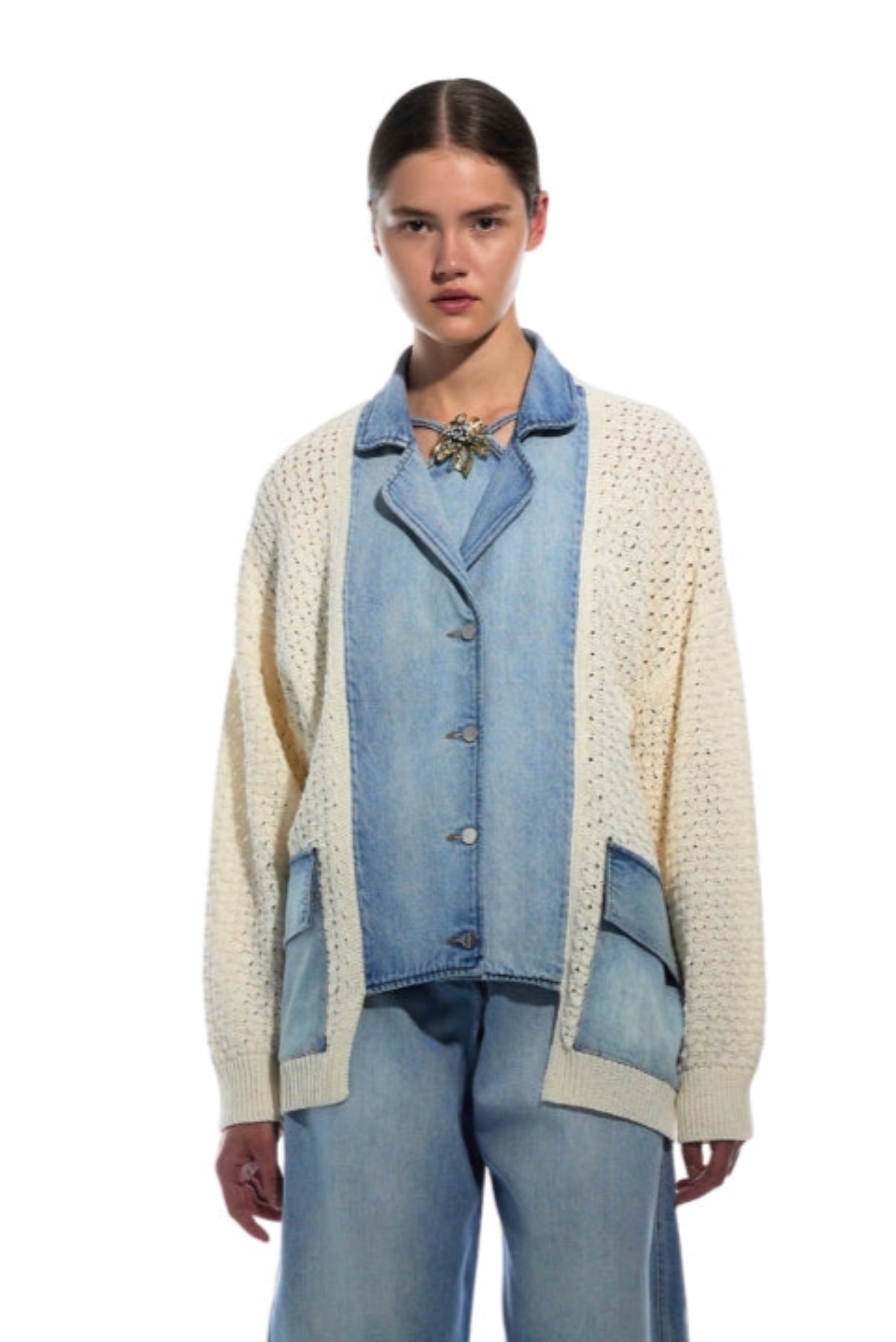 Saco tejido, mezcla de tejido artesanal con Denim, con dos bolsillos delantero