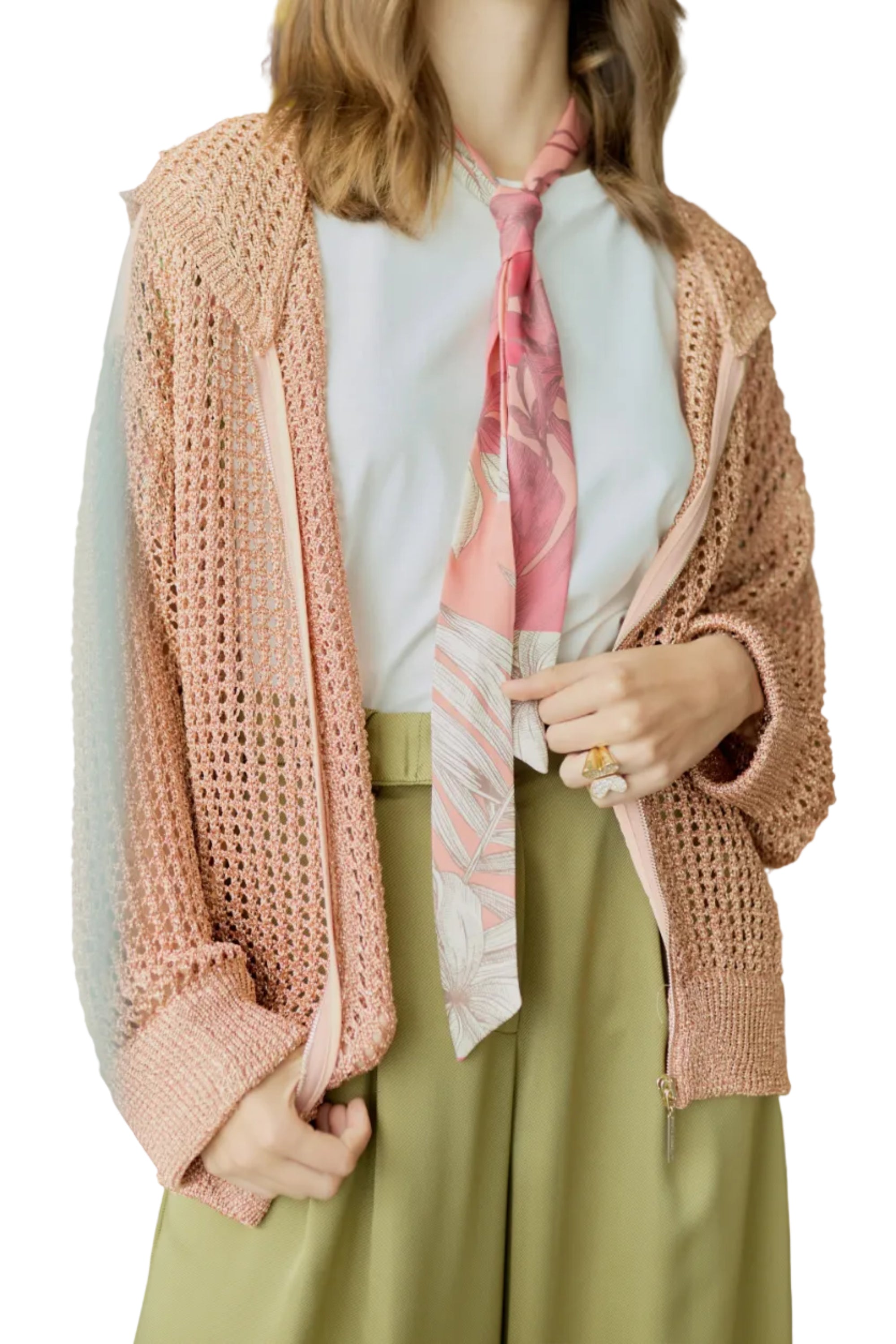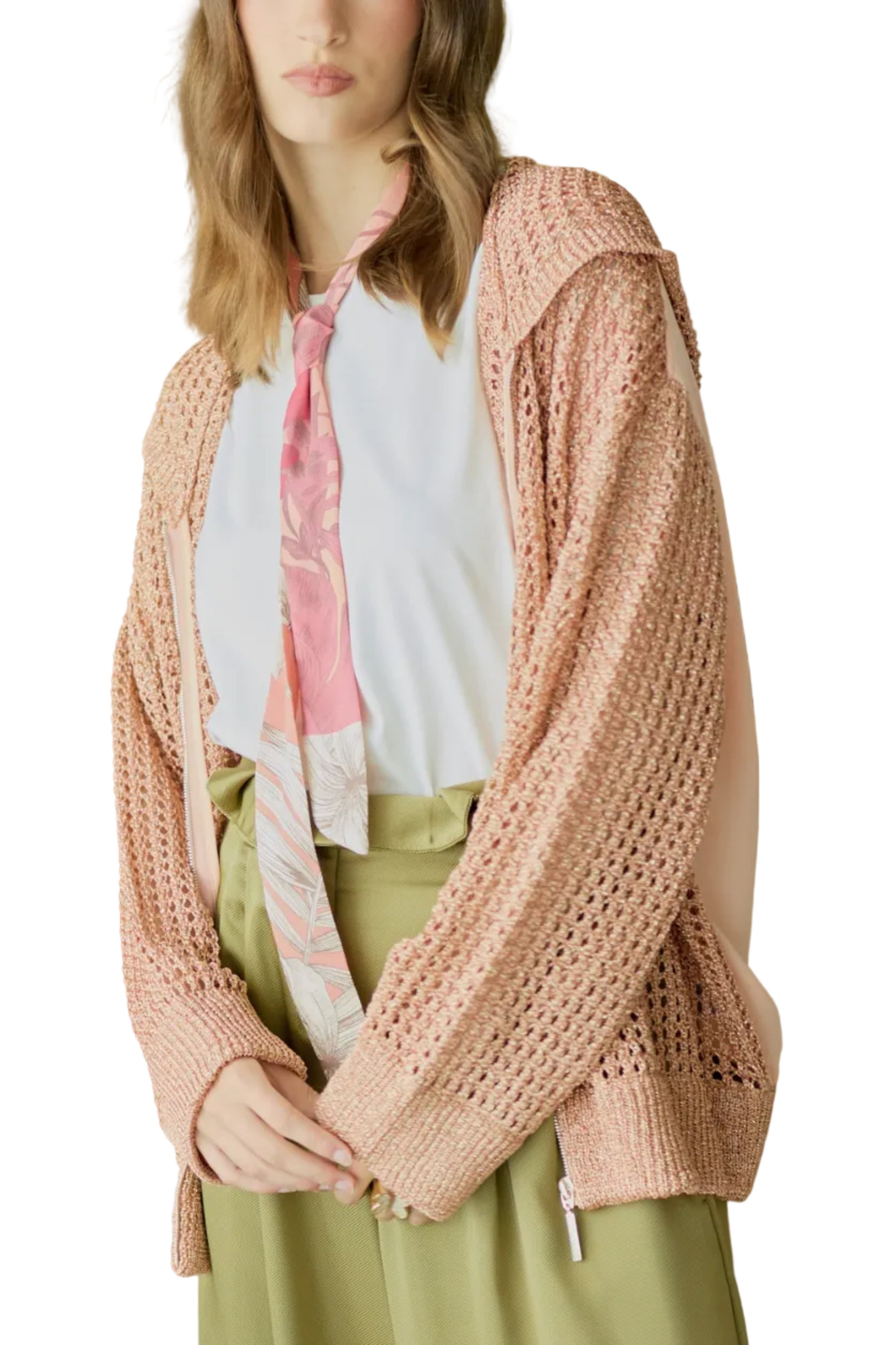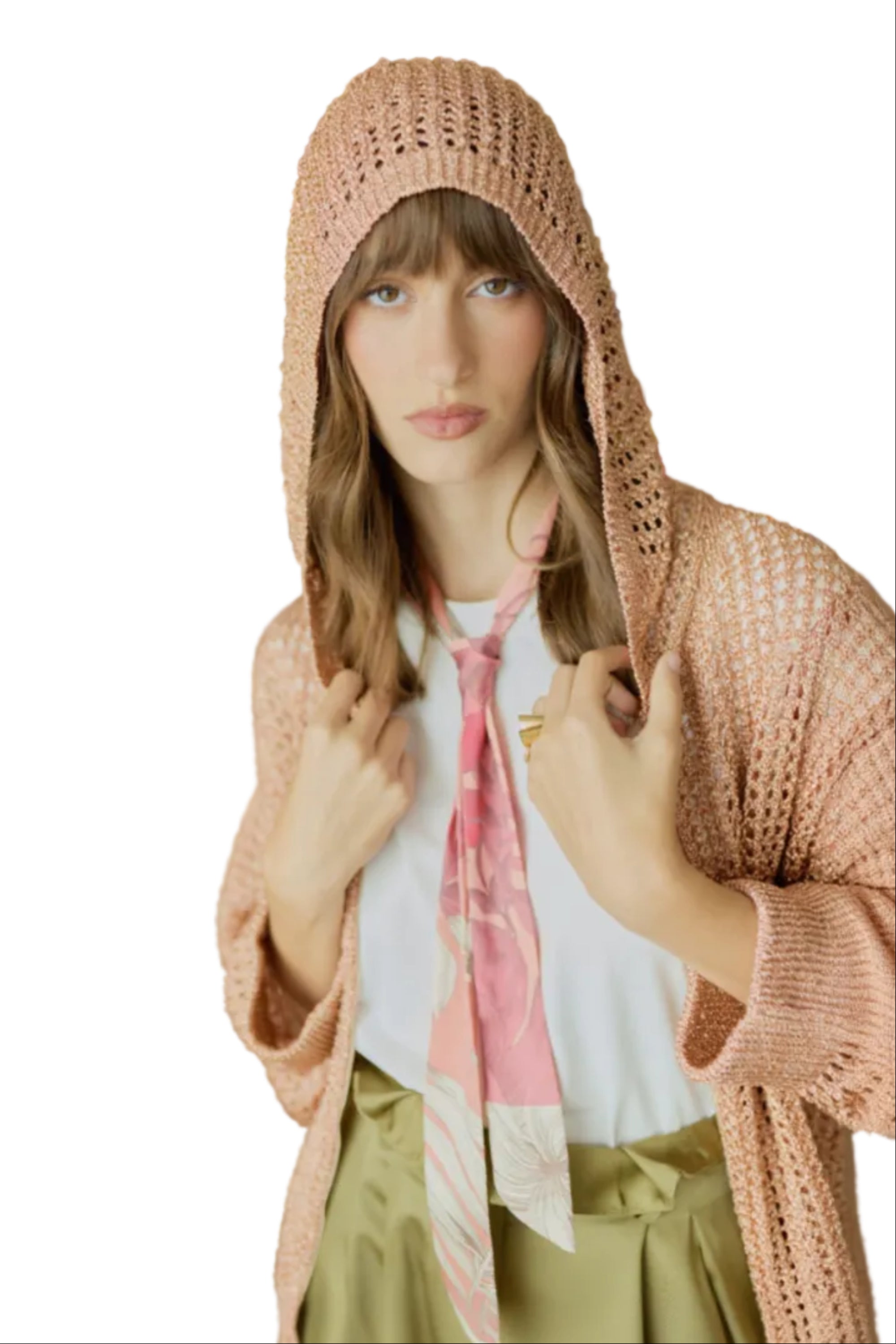 Casaca tejida m/l tipo crochet con capucha hilo viscosa y lurex forro crepe.