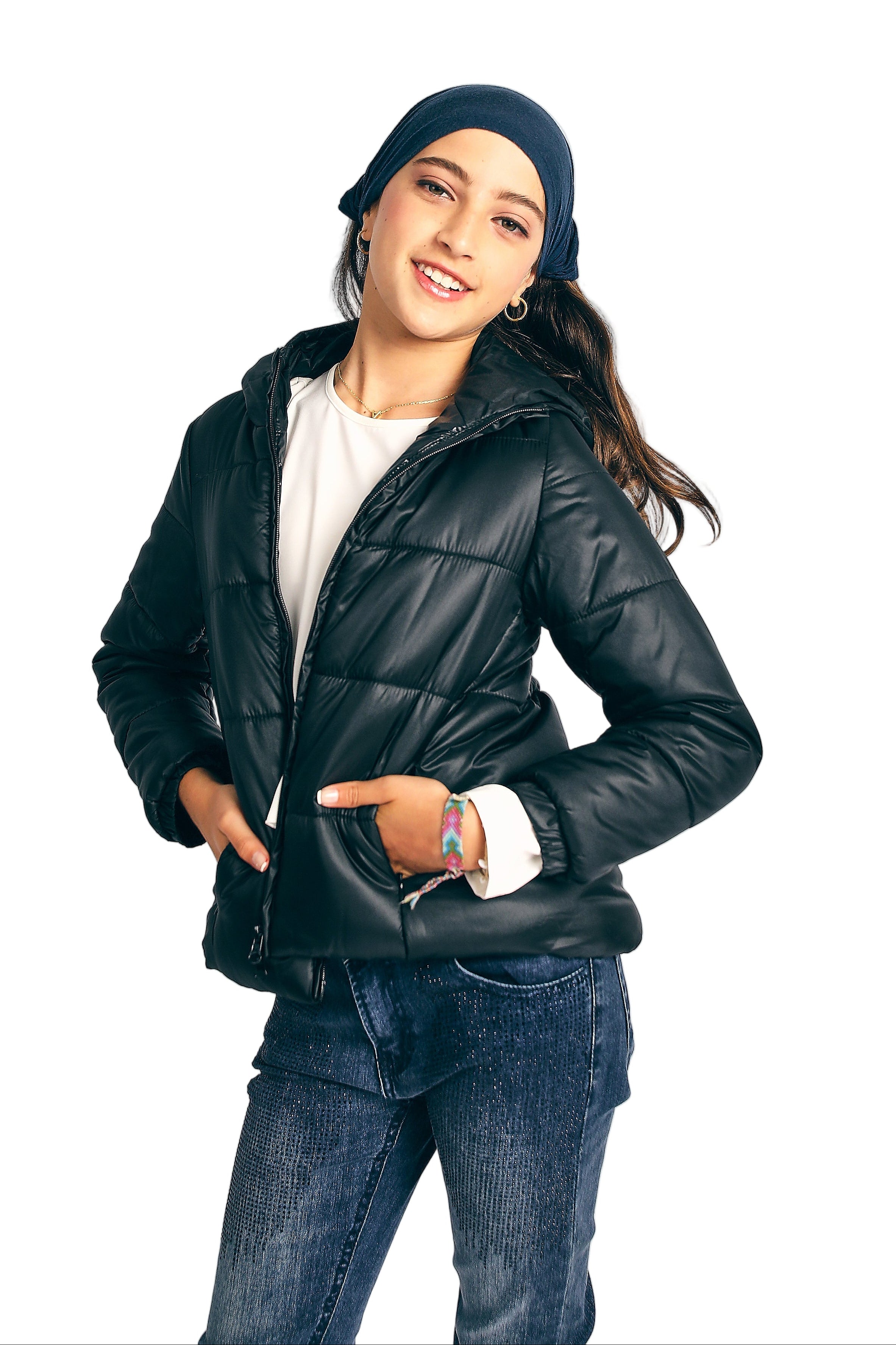 Casaca a la cadera con capucha acolchada tela nylon