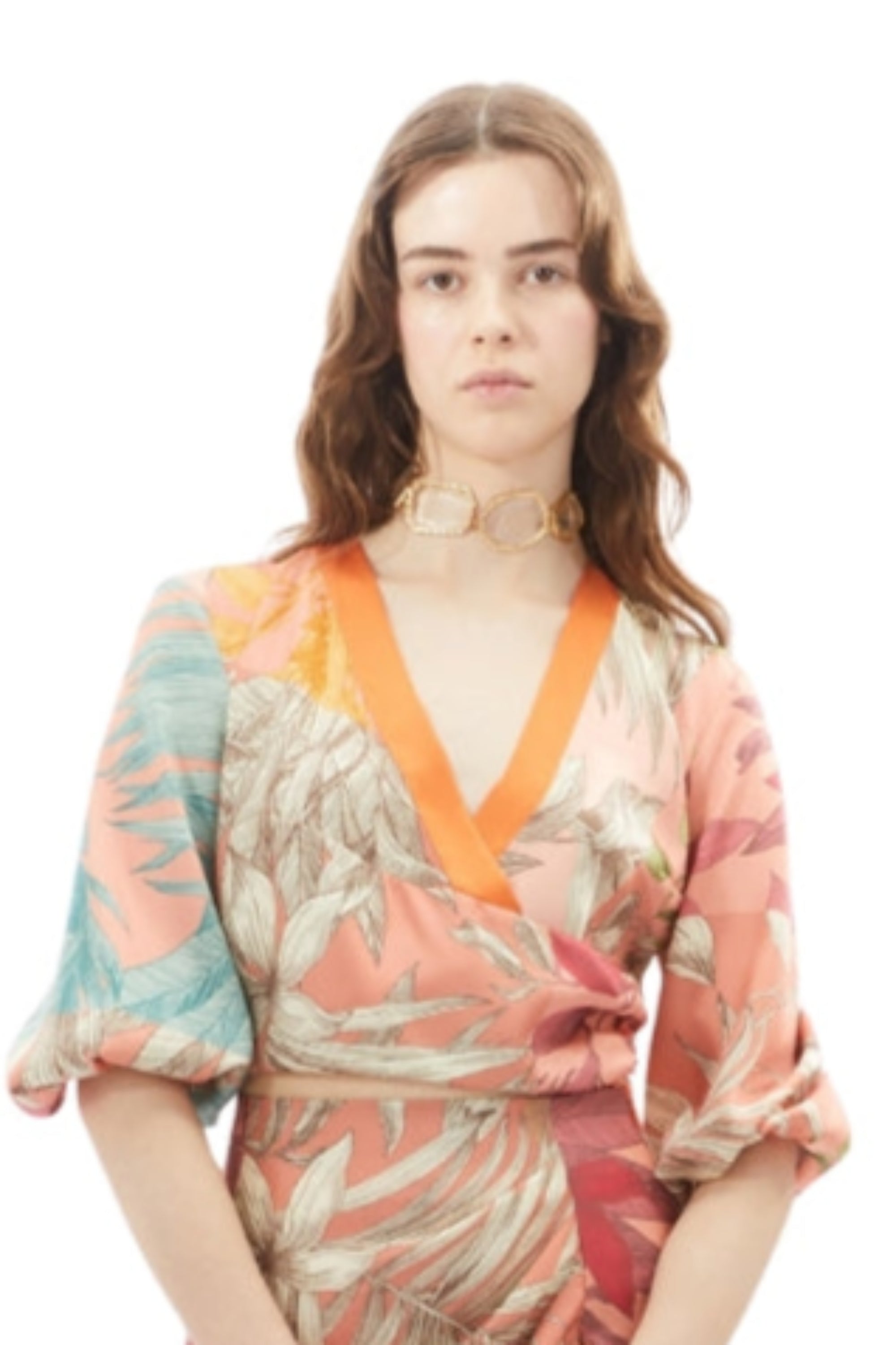 Blusa corta, de satin estampado motivo Primaveral, cuello V, con vivo de satin color entero, mangas bombachas.