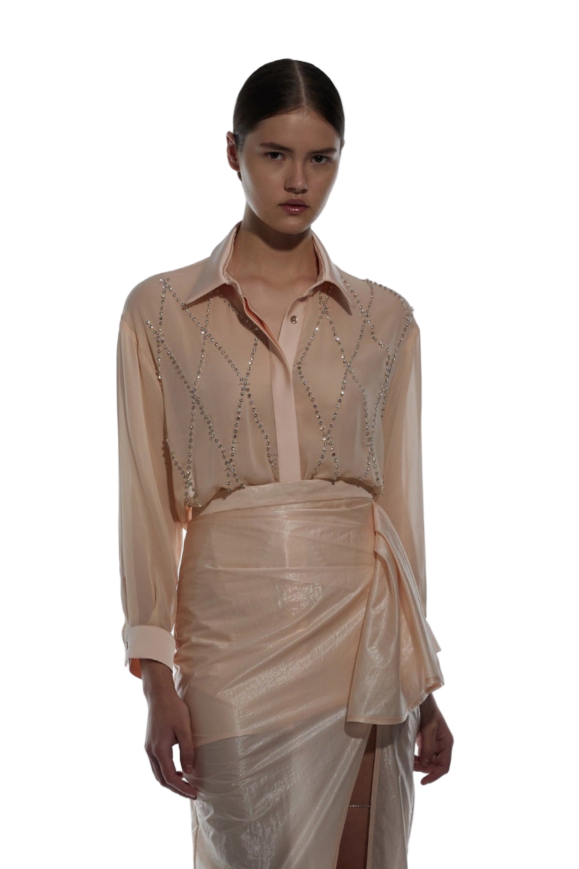 Blusas clásicas, onda cocktail, de gasa transparente, llena de aplique de rombos de swarosky.
