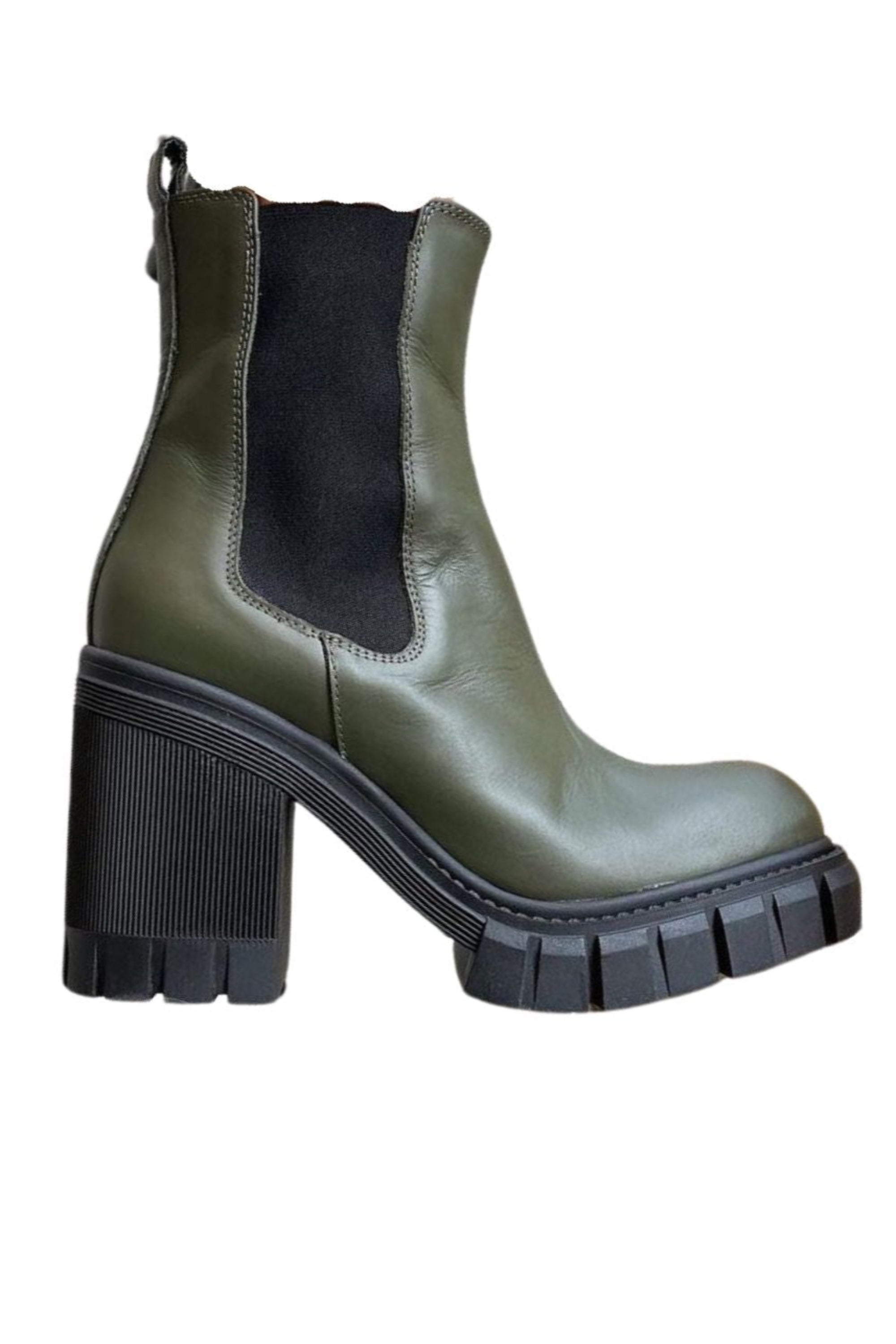 Botín todo de cuero , con elástico al costado, suele de plataforma de jebe con taco alto grueso