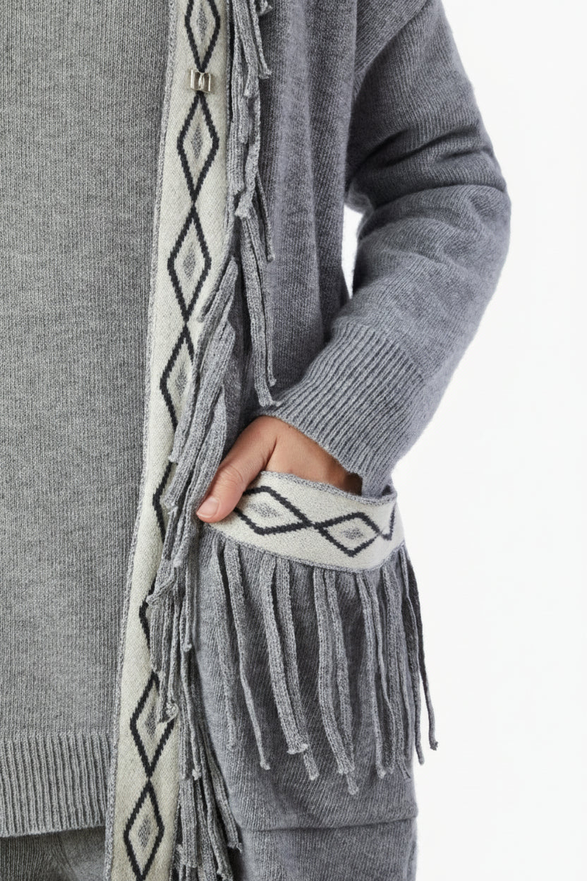 Cárdigan con bordado motivo rombos tribal y flecos. Tejido en mezcla de: Lana, acrílico, viscosa y cashmere.