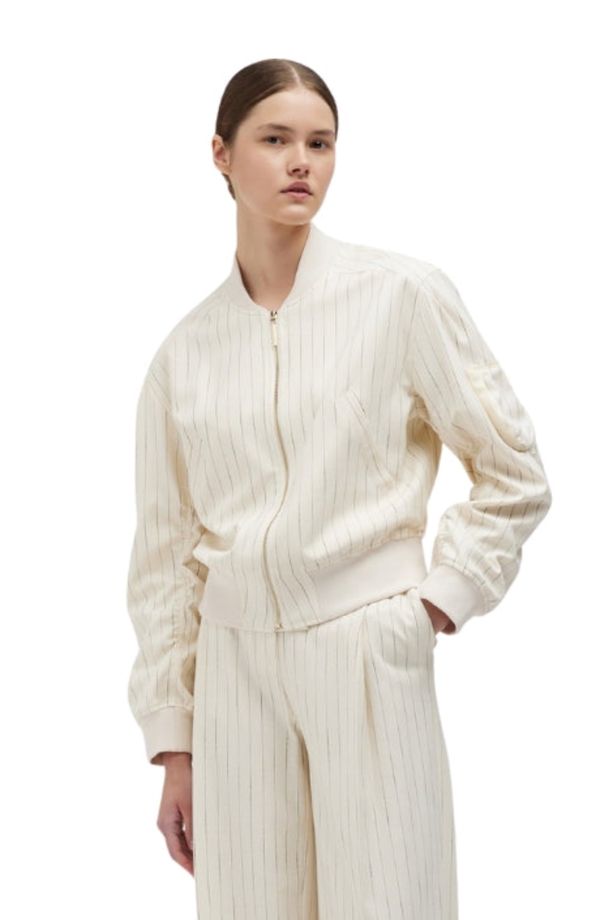 Casacas cortas tipo bomber, de lino viscosa stretch, a rayas con recogido en mangas. Puños y cuellos tejidos rib.