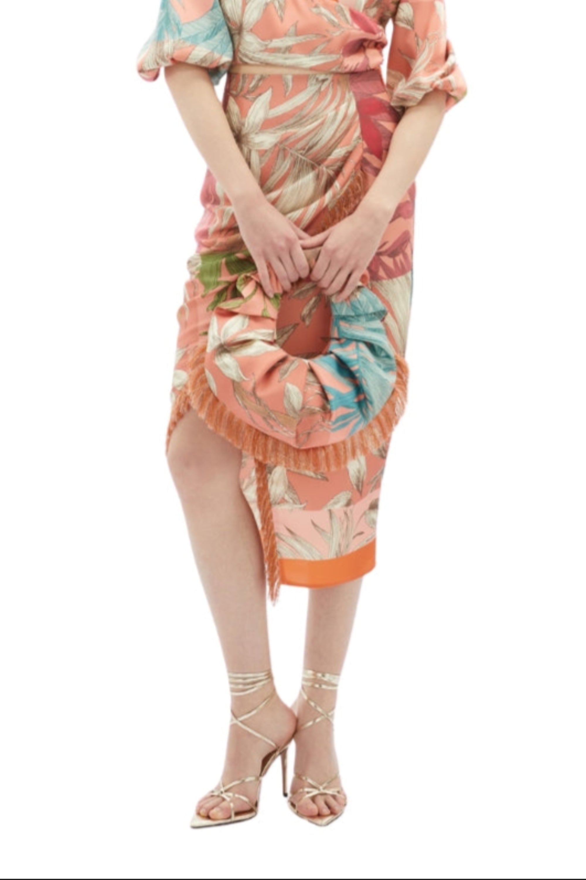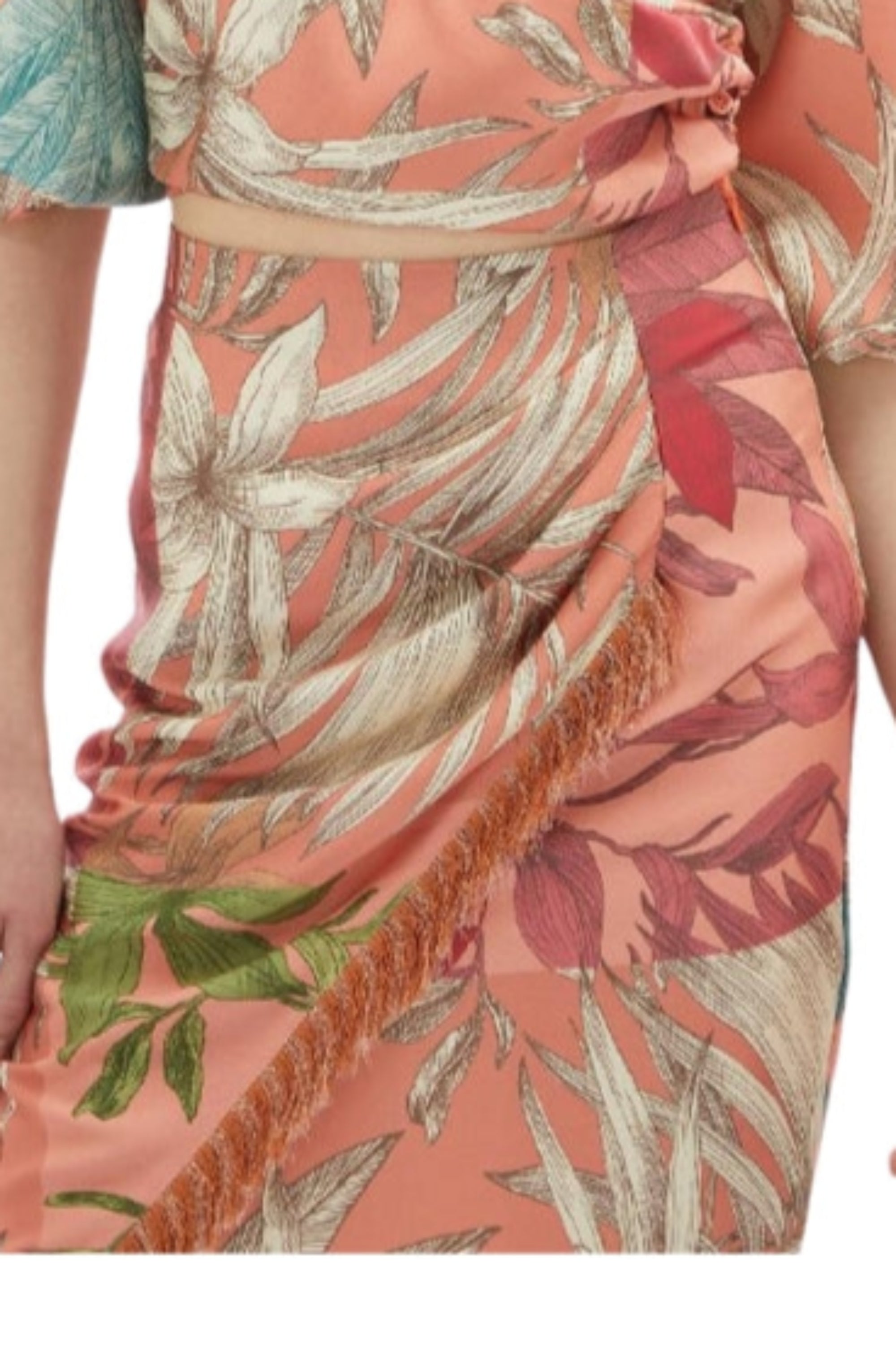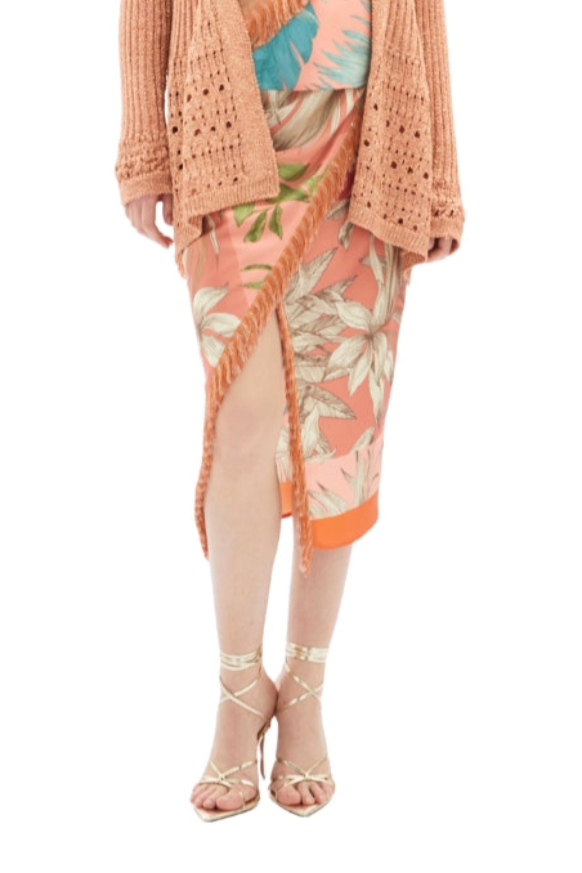 Falda cruzada, onda cocktail a la rodilla, de satin estampado motivo primaveral, con flecos en la basta