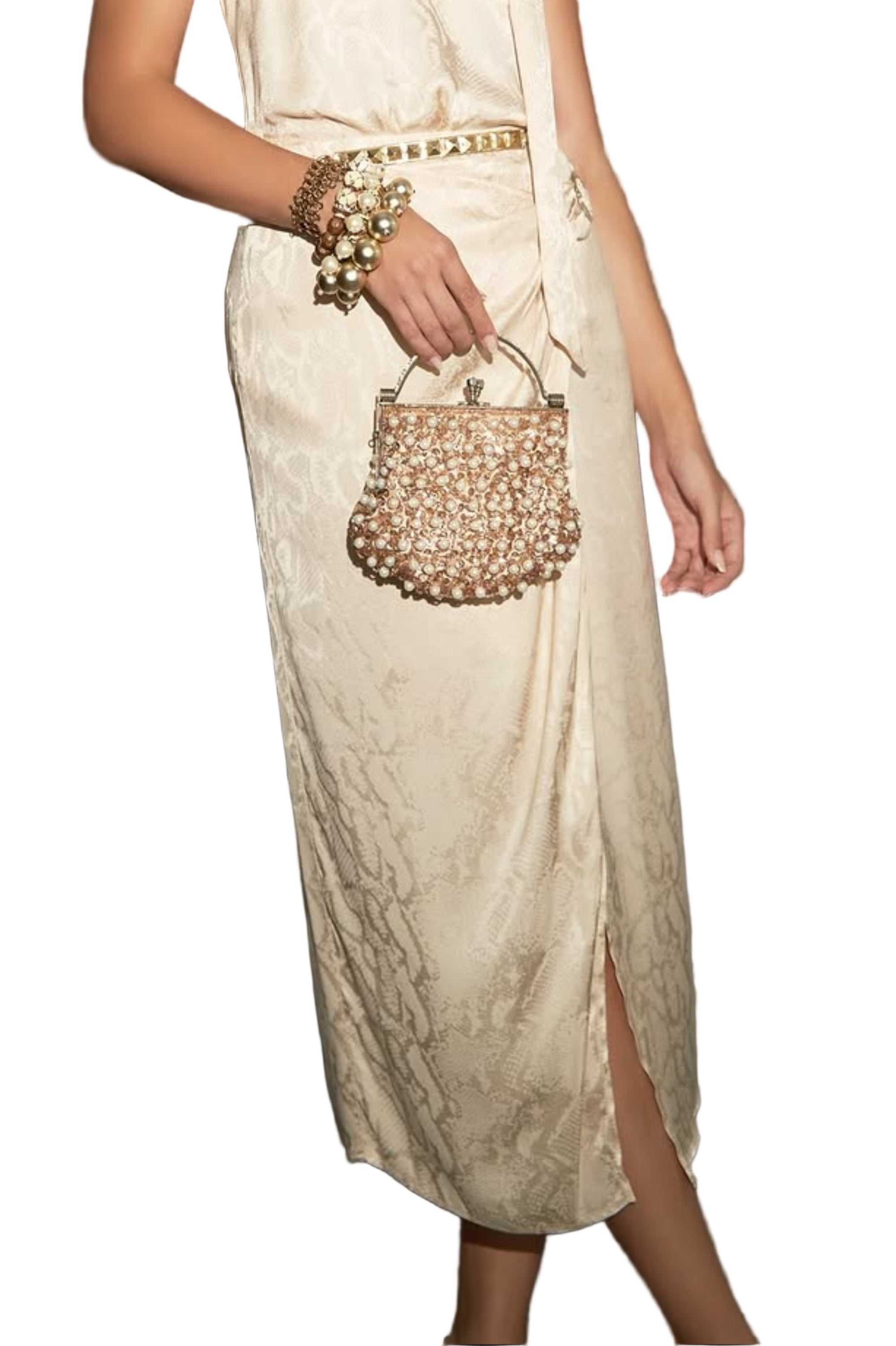 Falda cruzada, bajo de la rodilla, satín labrado y viscosa . Cruce con amarre de aro de adorno